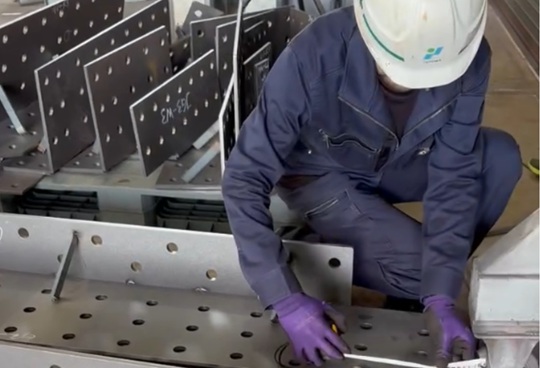 設計図をもとに、材料を切断し組み立てを行い、その接合部を溶接します。最新の溶接ロボットを使って仕事の効率を上げます。溶接加工が終わると製品検査を行います。検査を終えた製品は現場へ搬入されます。